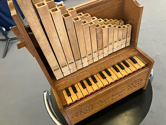 In May, I also had the opportunity to give a lecture on the history of the organ and ways of writing music. I retraced some of the stages in the organ's evolution. I presented the great Kitara organ and the positive organ. Thanks to the Alsace organ builder, I was also able to present the portable organ to the public. This little instrument has a 27-note keyboard, and you operate an air reservoir with your free hand (similar to an accordion). It was the first time I'd played it, and it was very interesting. During the conference, we also retraced some of the stages in the evolution of score writing. Over the years, music writing has evolved considerably (neume writing, organ tablature, etc.). Even today, there are many different ways of writing music (graphic score, guitar tablature, etc.).